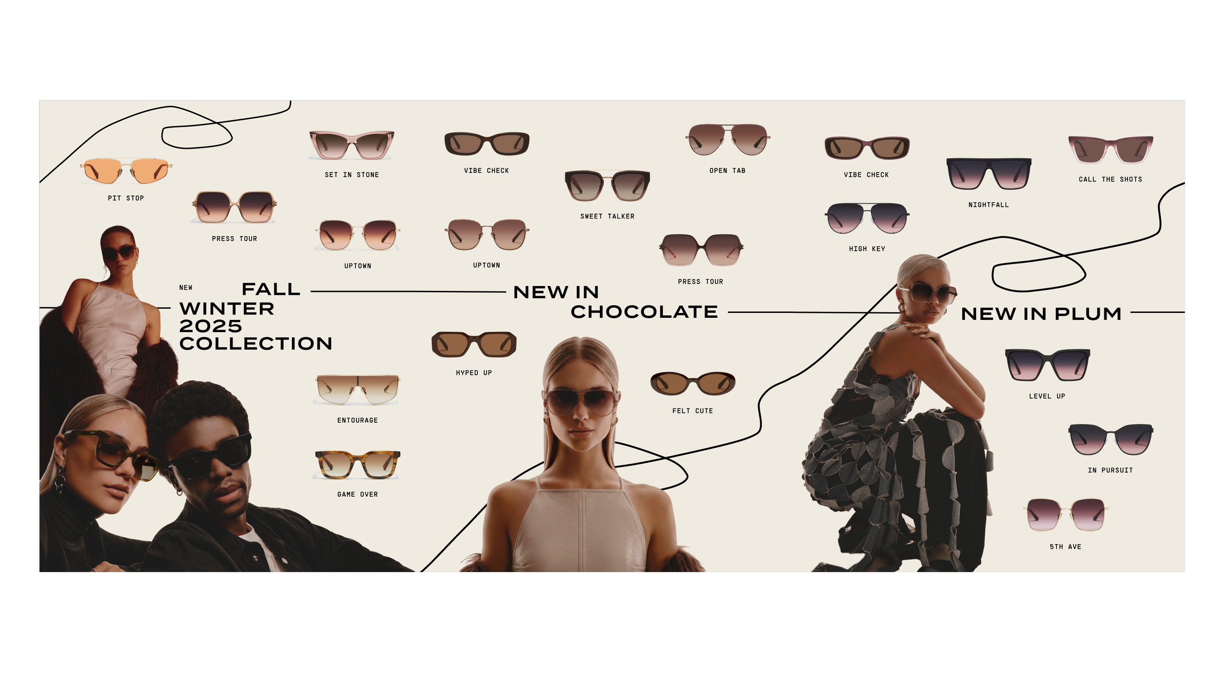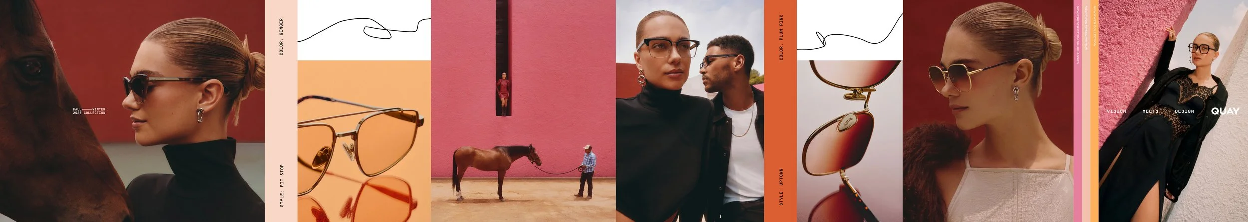 The launch phase revealed the full Fall world: rich tones, tactile visuals, and clean product storytelling. Shot at the iconic Barragán Stables, the campaign’s warm architecture and sculptural light grounded the season’s aesthetic. I developed the hero launch video and designed the supporting social carousel to introduce the collection and anchor the visual narrative across platforms. I also created a product overview layout to help buyers quickly understand the full range of frames and colorways at launch.